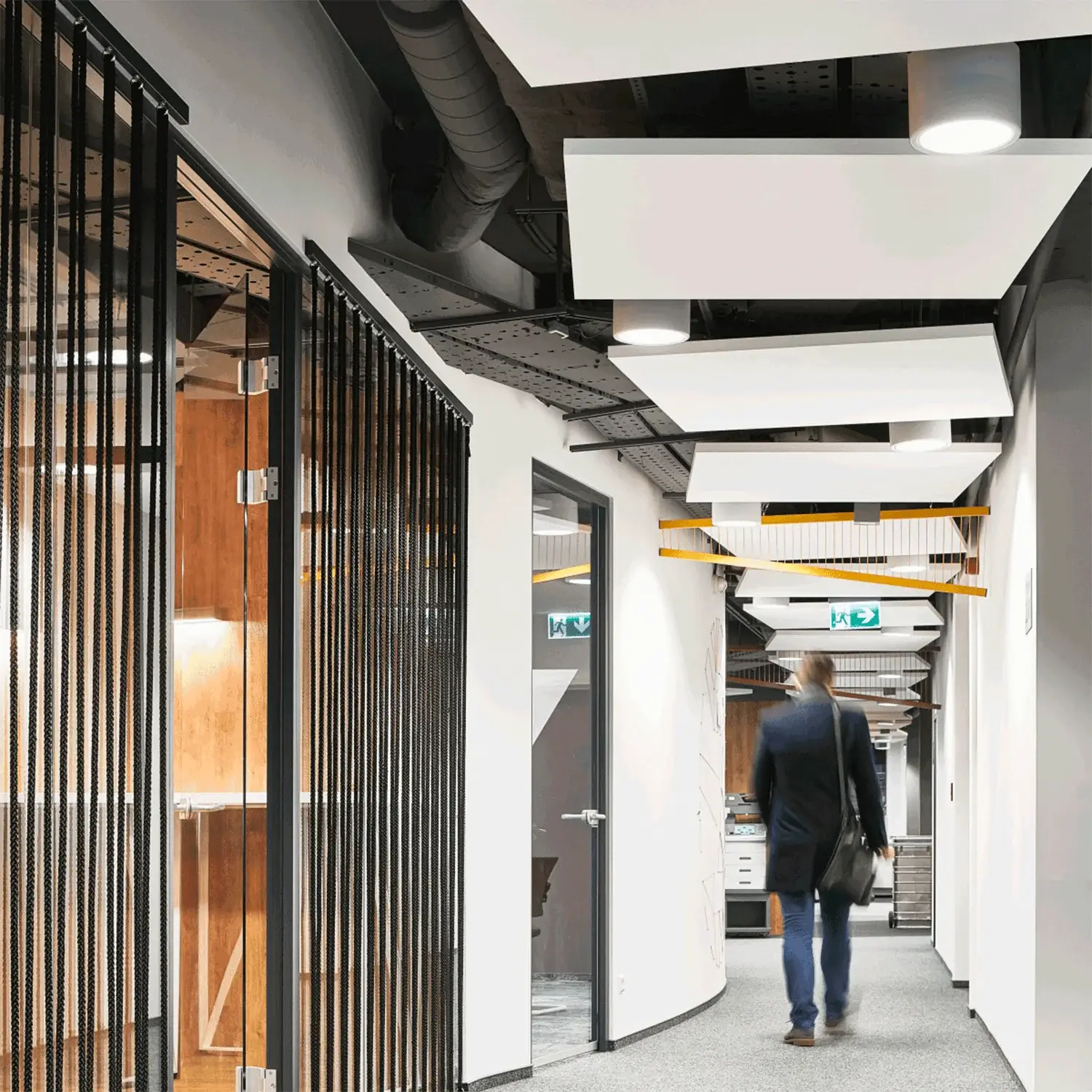 Акустичните панели на Ecophon от серията „Focus“ е тяхната най-голяма продуктова серия и предлага многообразие от съвременни визии, форми, размери и цветове. Системите от окачени тавани на Focus се монтират лесно и предоставят възможности, приложими в много области.