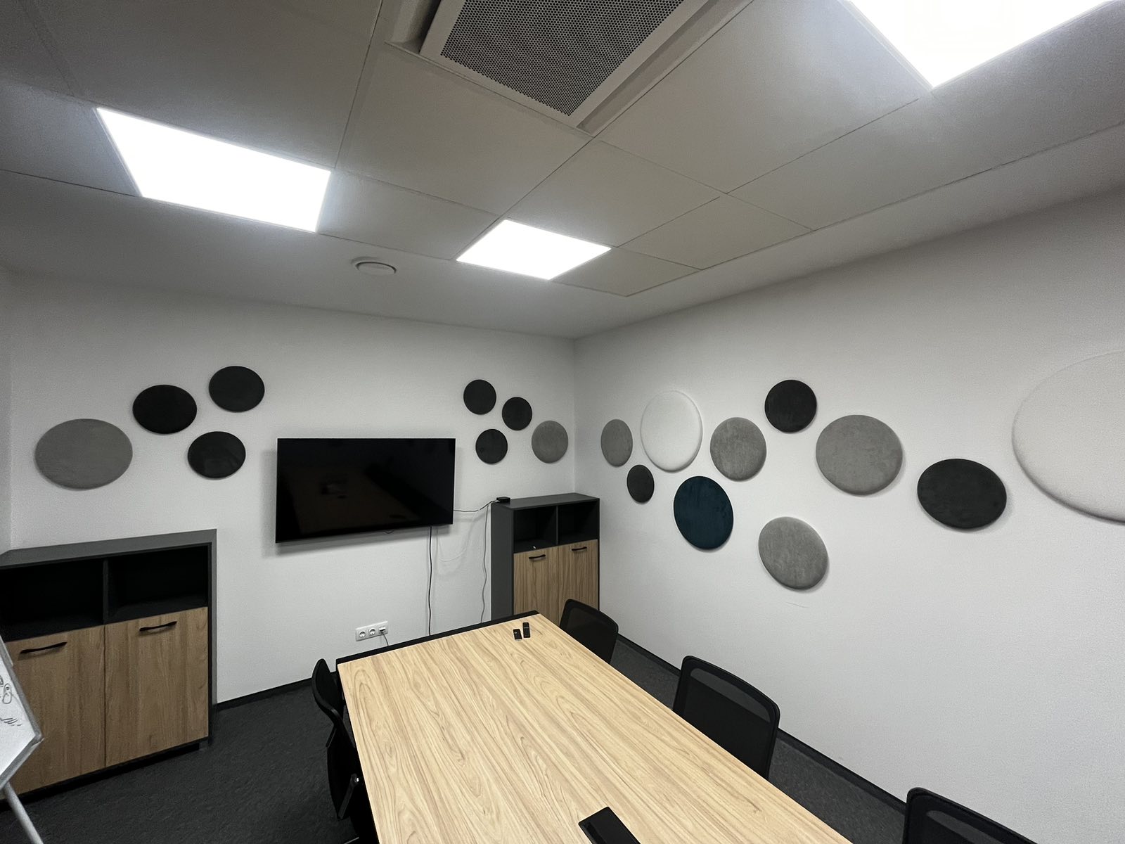 След анализ на проблемите и бюджетните параметри на клиента, предложихме акустично третиране на конферентните зали и част от отворените пространства. Решението включваше: