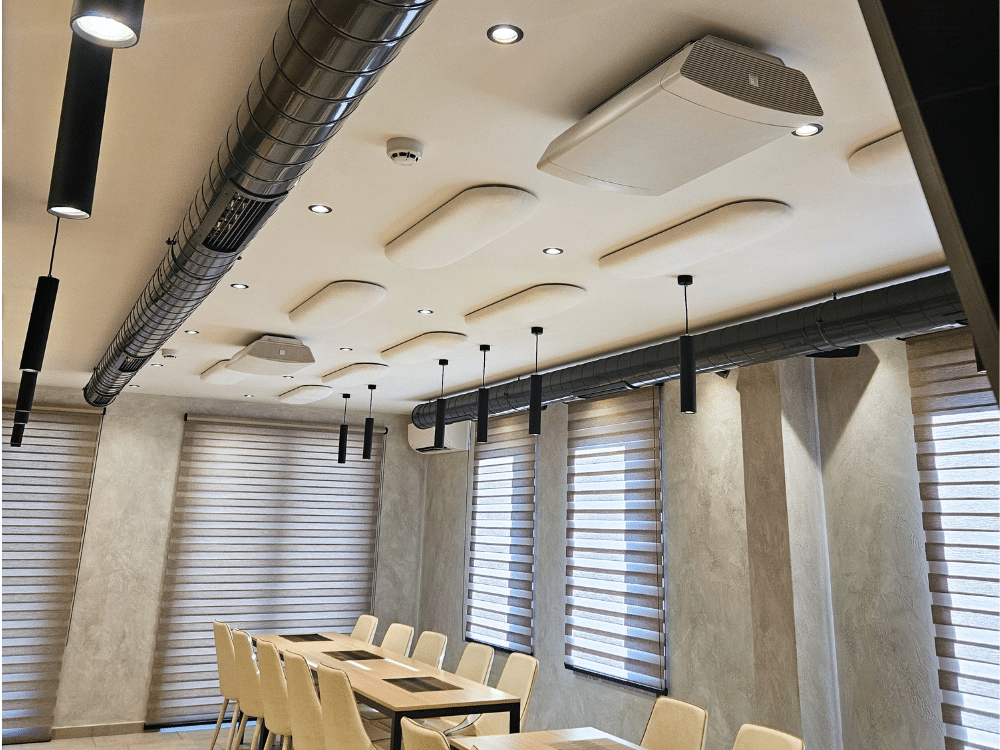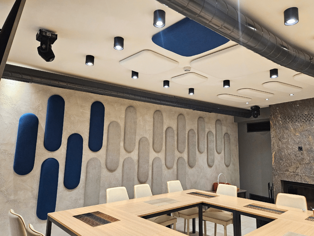 От Калистратов груп, водеща фирма в строителството, се свързаха с нас, тъй като имаха нужда от акустично решение за реновирания си ресторант в централния им офис, който се използва всеки ден за обяд на колектива им, както и за фирмени събирания. Залата на ресторанта не беше акустично третирана и в нея се получаваше дразнещо „ехо“.