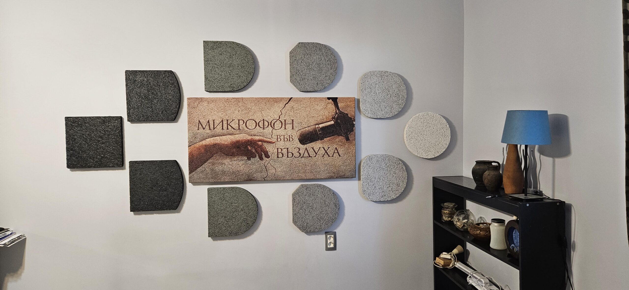 Подкаст студио „Микрофон във въздуха“ трябваше да отвори много скоро и те потърсиха Acoustic Force за бързо и качествено решение на проблема с акустиката на студиото. Клиентът имаше ясна визия за акустичните панели, които да се поставят на едната стена, която се оказа предизвикателство. Всеки един от панелите трябваше да бъде с различна форма, като някои бяха комбинация от остри и обли ъгли, части от елипси и т.н., а всеки панел беше и в различен цвят.