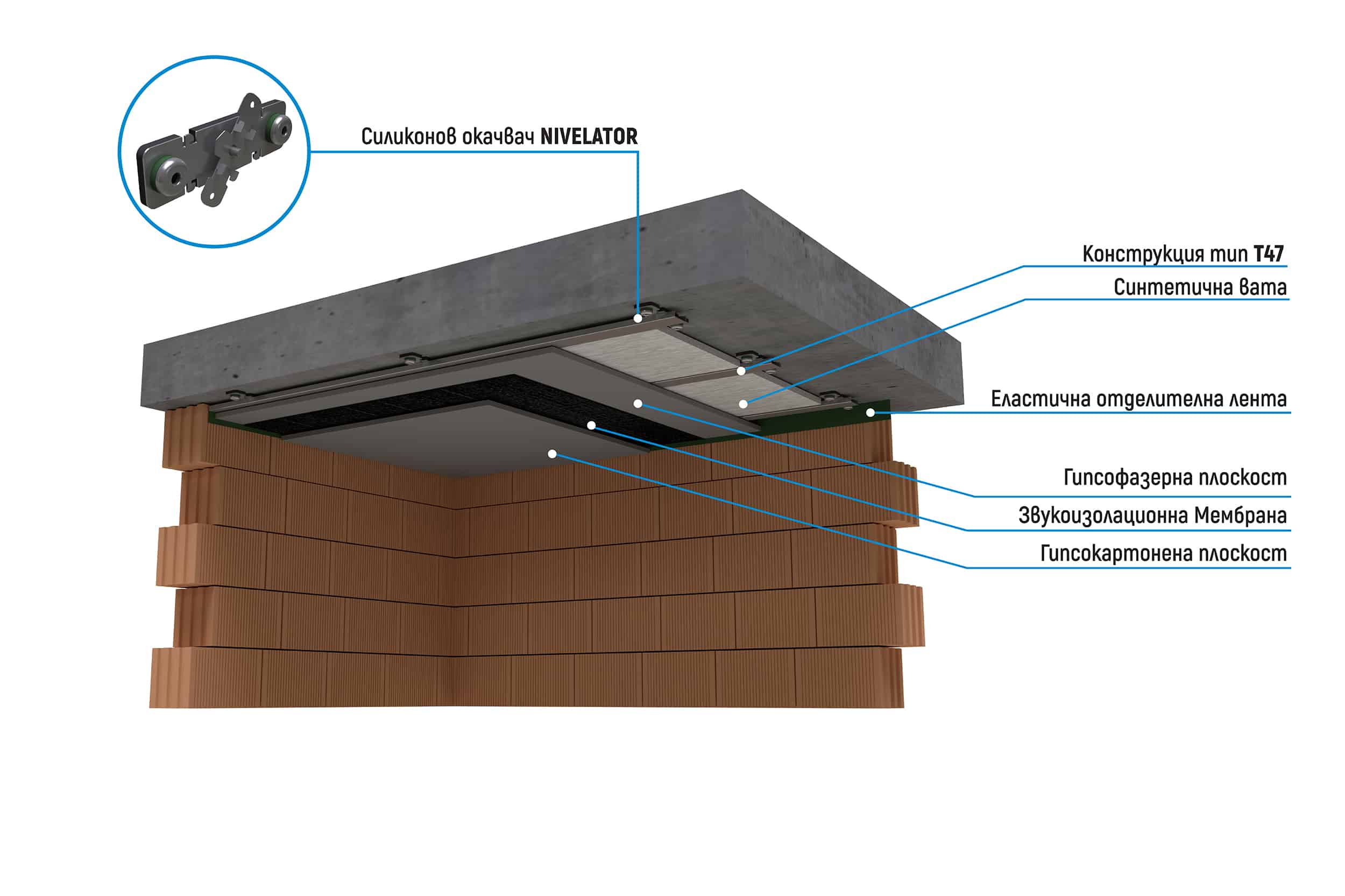 След оглед на място, екипът на Acoustic Force стигна до решение, че трябва да се направи звукоизолация на всички тавани, както и на четири стени. На таваните се поставиха системите Elastic control в комбинация с Nivelator UP. UP.